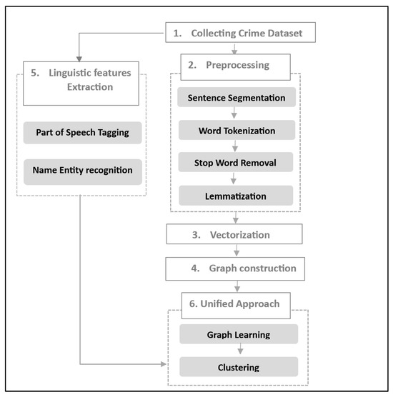 The proposed system, as shown in Figure 1, involves several steps: data collection, preprocessing, linguistic feature extraction, vectorization, graph construction, graph learning, and clustering. These steps can be described as follows: