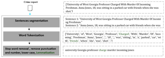 - Preprocessing: The crime reports collected for our research were preprocessed using the NLTK module, which involved performing crucial tasks including sentence segmentation, word tokenization, stop-word removal, and lemmatization. This pre-processing was carried out to minimize noise and enhance the accuracy of the analysis, as demonstrated in Table 2.
