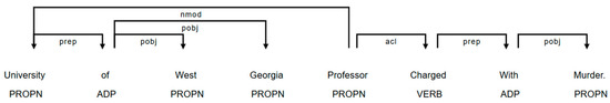Additionally, the Part of Speech (POS) tags extracted from the sentence included “University” (noun) “of” (preposition), “West” (proper noun), “Georgia” (proper noun), “Professor” (noun), “Charged” (verb) “With” (preposition), “Murder” (noun) as shown in Figure 5.