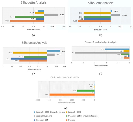 The Calinski–Harabasz Index (CHI) results, as shown in Figure 8e, reveal significant variations in clustering performance across different methods. K-means alone shows the highest CHI value at 3995, indicating strong cluster separation in the base algorithm. The integration of GCN and linguistic features with K-means resulted in a substantially lower CHI of 1539, suggesting that these additional features may have reduced the distinctiveness between clusters. Spectral clustering demonstrated moderate performance with a CHI of 14.2, while K-means + GCN achieved a CHI of 3.12. Notably, spectral + GCN and spectral + GCN with linguistic features showed relatively lower CHI values. These results present an interesting contrast to other evaluation metrics (like the Davies–Bouldin Index), suggesting that while some methods may create well-separated clusters (high CHI), they might not necessarily provide the most optimal overall clustering solution when considered alongside other performance metrics.