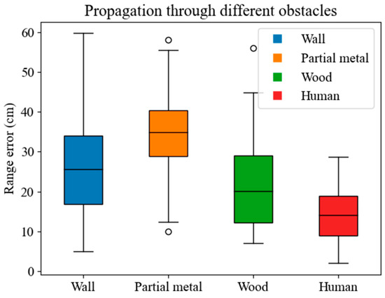 Figure 1 shows the boxplot range error for different propagation scenarios in our acquired data. It can be seen that the range error is very high during partial metal propagation. The mean range error also varies for different propagation materials.