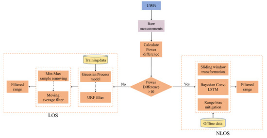 The overall system architecture of the proposed UWB range measurement error mitigation for both LOS and NLOS environments.