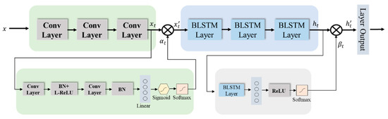 The overall architecture of Conv-BLSTM layer and the proposed attention module.