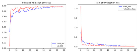 The training and validation accuracy of the proposed model, along with their losses.