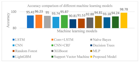Figure 9 shows the accuracy comparison of various machine learning models for NLOS classification, including LSTM, Conv + LSTM, CNN, CNN + CRFz, random forest, XGBoost, LightGBM, support vector machine (SVM), Naïve Bayes, decision trees, MLP, and the proposed model. The proposed model achieved the highest accuracy of 98.78%, significantly outperforming CNN + CRF (95.87%), LSTM (95.41%), and other models like LightGBM (94.24%), SVM (94.81%), decision trees (93.18%), XGBoost (92.88%), and random forest (91.53%). These results highlight the robustness of the proposed approach in effectively capturing features and adapting to challenging NLOS environments.