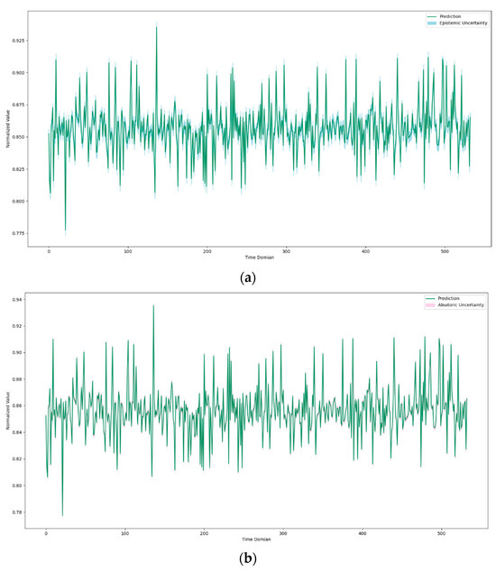 Uncertainty estimation plots with respect to the proposed model’s prediction; (a) the epistemic uncertainty of the proposed model, (b) the aleatoric uncertainty or inherent noise of data calculated using the proposed model.