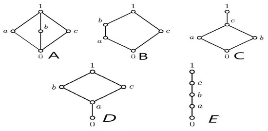 Since we have only five types of lattices with five elements (see Figure 1), from [27], to obtain divisible residuated lattices (DRLs), the lattice of ideals must be of the type , or . is the pentagon lattice, which is not modular and can be excluded. Either only remains, the diamond lattice (which is not distributive but is modular), or . But involves the existence of a ring with five ideals and three of them have to be maximal ideals, which is false, from Remark 8. Therefore, only remains. From here, we have that, to find an example of DRL, which comes from a multiplication ring, and an MTL ring, which is not a multiplication ring, we must search between infinite commutative and unitary rings and not between finite commutative and unitary rings.