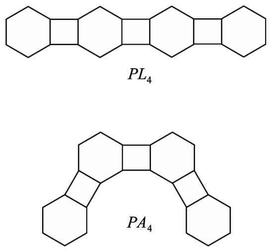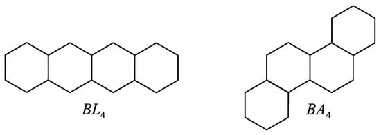 Let G be a catacondensed benzenoid graph or a phenylene, and let h be a hexagon of G. Hexagon h is called terminal if it is adjacent to exactly one other inner face of G, and it is called branched if it is adjacent to exactly three other inner faces of G. If h is adjacent to exactly two other inner faces, it has two vertices of degree two. Then, h is called angular if these two vertices are adjacent and linear it they are not adjacent. Moreover, a catacondensed benzenoid graph or a phenylene is called a linear chain if it does not contain angular or branched hexagons. The linear benzenoid chain with hexagons will be denoted by , and the linear phenylene chain with hexagons will be denoted by . Similarly, a catacondensed benzenoid graph or a phenylene is called an angular chain if it does not contain linear or branched hexagons. An angular benzenoid chain with hexagons will be denoted by , and these graphs are also called fibonaccenes. Finally, an angular phenylene chain with hexagons will be denoted by . See Figure 1 and Figure 2.