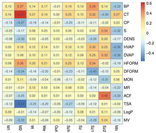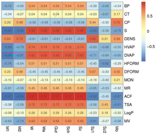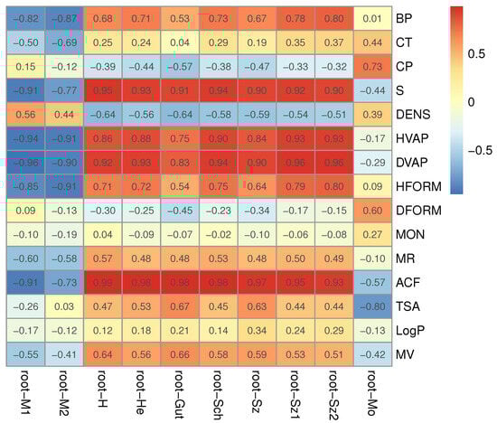 A heatmap of correlation coefficients between molecular properties and root-indices for the set of 18 octane isomers. For example, the notation “root-M1” represents the first Zagreb root-index.