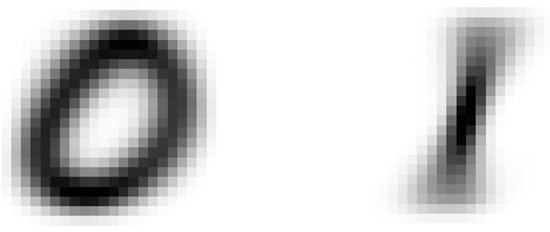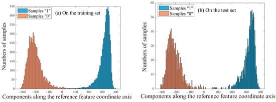 The MINST training set comprises 6742 samples “1” and 5923 samples “0”. We select the difference between the means of samples “1” and “0” as the reference feature, i.e., . Optimization Algorithm 1 converges after 166 iterations. The means of samples “1” and “0”, the design variables, and the reference feature coordinate , are visualized in Figure 1, Figure 2 and Figure 3. Due to obvious differences in the mean feature, digits “0” and “1” can be identified using only one mutual-energy inner product coordinate . Figure 4a shows the training sample distribution in accordance with the components on . Figure 5a gives the Confusion Matrix of the classification results, where the horizontal and vertical axes correspond to the target class and the output class of the classifier, respectively. In the Confusion Matrix, the column on the far right shows the precision of all the examples predicted to belong to each class, and the row at the bottom shows the recall of all the examples belonging to each class; the entry in the bottom right shows the overall accuracy; the diagonal entries are the correctly classified numbers of digits “0” and “1” and the off-diagonal entries correspond to the wrong classifications. This binary Gaussian classifier on the training set achieves a very high overall accuracy of 99.66%, shown at the bottom right of the Confusion Matrix.