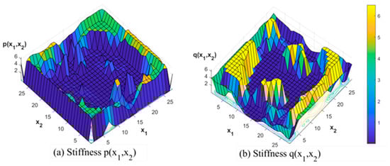 If and are given, in Expression (34) is a quadratic and concave functional with respect to , due to and . If is given, is a linear function with respect to and .Through using the Univariate Search Method to solve Expression (34), if and are given, the maximum value of can be found by solving Expression (31) for , and if is given, the maximum value of will be reached on the lower bounds of and . So, the lower bounds of and must be larger than zero to ensure that Expression (29) has a finite optimal solution. In addition, the upper bounds of and should also be constrained to avoid the trivial solution . Therefore, when the optimization objective is to maximize the mutual-energy inner product, as shown in Expression (29), its optimal structural model would be the minimum stiffness structure, and the selected feature belongs to a low-frequency eigenfunction subspace. On the contrary, if the optimization objective is to minimize the mutual-energy inner product, the optimal structural model would be the maximum stiffness, and the selected feature would be mapped to a high-frequency eigenfunction subspace.
