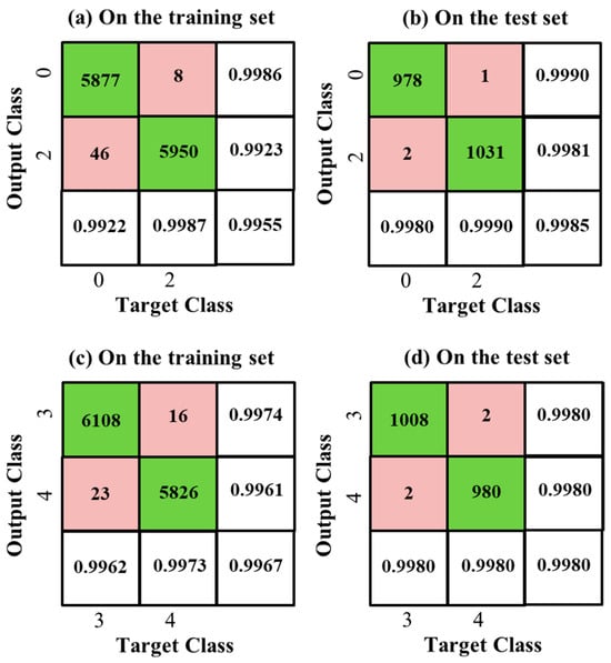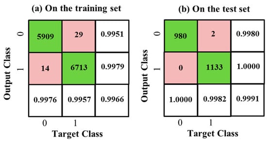 The MINST training set comprises 5958 samples “2” and 5923 samples “0”, and the MINST test set comprises 1032 samples “2” and 980 samples “0”. Similarly to the previous classifier, the reference feature is also selected as . The difference in the mean features of digits “2” and “0” is not as significant as that of digits “1” and “0”. If only one mutual-energy inner product coordinate is used for classification, the accuracy is only 96.72% on the training set and 97.81% on the test set. In order to improve the classification accuracy, we use Algorithm 2 to generate 60 mutual-energy inner product coordinates based on the training sample set and its subsets, and construct a 60-dimensional Gaussian classifier. The Confusion Matrices of the classification results are given in Figure 6a,b, showing an overall accuracy of 99.55% on the training set and a higher overall accuracy of 99.85% on the test set.