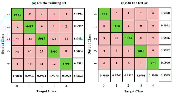 In the training set, we select one digit from samples “0”, “1”, “2”, “3” and “4” as the first class and the other training samples of the five digits as the second class, and we take the two classes as the training sample set. Then, we select the difference between the means of the samples in the two classes as the reference feature, i.e., , and use Algorithm 2 to generate 120 mutual-energy inner product coordinates. In this way, we construct 5 training sample sets and finally generate 600 coordinates. However, many of them are linearly dependent; in order to identify the digits “0”, “1”, “2”, “3” and “4”, we use matrix singular value decomposition to reduce its dimensions from 600 to 60 and construct a 60-dimensional multiclass Gaussian classifier. Figure 7 shows an overall accuracy of 98.22% on the training set and a higher overall accuracy of 98.83% on the test set.
