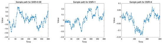 Sample paths for SNR = {0.08, 1, 4} with sample size .