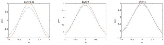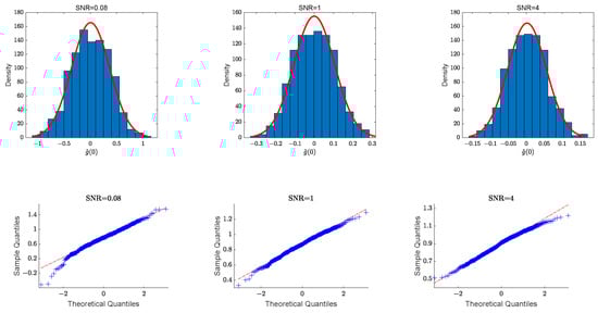 We calculate the mean of the estimation measures to focus on the overall performance of the methods. However, this approach does not allow us to verify the proximity of each estimated value to the true across the sample period. Moreover, as the sample size increases, the number of parameters to be estimated also grows, potentially introducing a significant bias in fitting the function . To address this, we fit the curves of by substituting the true into the estimator from Equation (4). Due to the fact that there are as many estimators as observations T and the non-stationarity of the model, the asymptotic theories are not involved in the previous section. However, the asymptotic nature of is verified using histograms and Q-Q plots. Since the values of are near 0, Figure 2 shows the histograms and Q-Q plots of at point 0 for three parameter selections when the sample size is . We can see that the vertical bars and distribution curves in the histograms and the scatter and straight lines in the Q-Q plots are very close to each other, meaning that empirically the estimates of the unknown function are asymptotically normal. Figure 3 presents the fitted curves of the function for SNR = {0.08, 1, 4} with sample size . It is evident that the fitted curves are close to the real curves. The estimators for the unknown function are assessed using the root mean squared error (RMSE), defined as RMSE = , where represent the regular grid points. Table 4 indicates that the RMSE values for are small and decrease as the sample size increases.