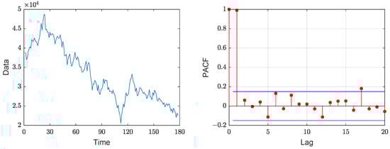 This section utilized the closing points of the S&P/HKEX Large Cap Index (SPHKL) to demonstrate an application of our model and estimation methods. The dataset, spanning from 6 September 2020 to 28 January 2024, is accessible online at the website (https://cn.investing.com/indices/s-p-hkex-lc-chart, accessed on 11 February 2024). A stock index encapsulates the overall trend and volatility of stock prices in the market, making it a complex financial time series with characteristics such as time dependence, nonlinearity, and non-stationarity. Given these attributes, forecasting stock indices holds substantial practical importance for both investors and regulatory bodies. The dataset comprises 178 weekly observations, and Figure 4 illustrates their closing points along with the Partial Autocorrelation Function (PACF) plots. It is intuitively obvious from the sample path that the dataset is non-stationary.