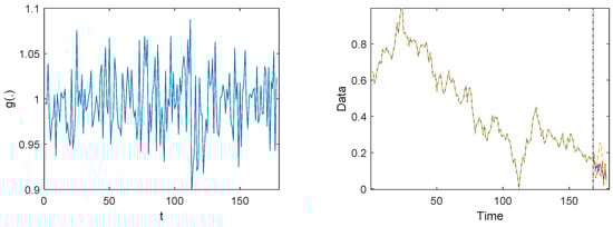 For the analysis, the dataset is divided into a training set, encompassing 168 data points from 6 September 2020 to 19 November 2023 and a test set, comprising 10 data points from 26 November 2023 to 28 January 2024. The training set is used to fit the model and estimate the parameters, while the test set serves to evaluate the predictive ability of the model. The OLS method is used to estimate the parameters. The local linear regression method, as defined by in Equation (4), is used to estimate the function. The estimator of function is presented in Figure 5. From the figure, we can see that there is a clear unsteady volatility. This volatility suggests that the model captures the dynamics in the time series data and that the autoregressive coefficient is not constant but varies over time. The estimated value of is 0.0016, while the variances are estimated as and .