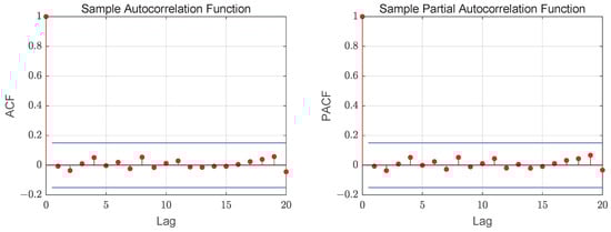 The results verify the performance of our model and method. To verify the adequacy of the model, we analyze the standardized Pearson residuals. Figure 6 exhibits the ACF and PACF plots of the residuals, which indicate the absence of correlation among the residuals. For our model, the mean and variance of the Pearson residuals are 0.0685 and 1.0003, respectively. As discussed in Aleksandrov and Wei (2019) [], for an adequately chosen model, the variance of the residuals should take a value approximating 1. Accordingly, the proposed model is deemed to fit the data satisfactorily.