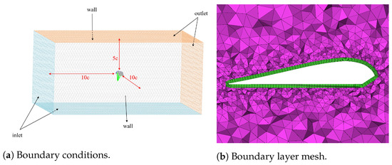 The flow field is depicted in Figure 4a, with the boundaries meshed using triangular shell elements. The volume mesh is generated automatically by LS-DYNA, where c is the chord length of the parafoil. The distances from the flow field boundaries to the center of the parafoil delivery system are set at , , and , respectively []. The inlet serves as the velocity entrance, with the incoming flow speed set to the glide speed of the parafoil delivery system, and the angle of attack is set by the direction of the incoming flow. The outlet acts as the drag exit, and the wall is a free-slip surface. Air is considered an incompressible fluid with a density of 1.225 kg/m3 and a reference pressure value of 101,325 Pa. The boundary layer mesh size for the flexible canopy is 1 mm, as shown in Figure 4b. The Spalart–Allmaras (SA) turbulence model excels in handling flows near the wall of the flexible canopy and in adverse pressure gradients. Its computational efficiency and accurate portrayal of the physics of the boundary layer make it a suitable choice for simulating the aerodynamic characteristics of parafoil delivery systems [].