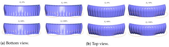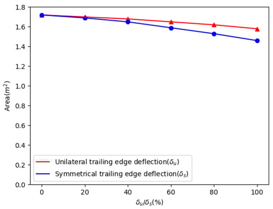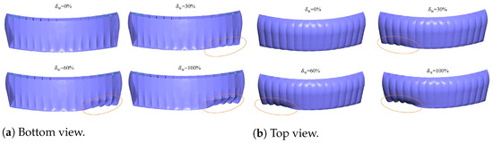 Compared to the rigid canopy assumption of the traditional 8-DOF parafoil delivery system dynamics model, the flexible canopy can more accurately reflect the deformation and stress distribution during actual flight, thereby providing more precise aerodynamic predictions. Figure 5 shows a comparison before and after the canopy inflation, revealing a significant change in the projected area after inflation. The curve illustrating changes in the canopy area is shown in Figure 6. Figure 7 presents the simulation results of the unilateral trailing-edge deflection of the flexible canopy, where the deflection causes numerous wrinkles and irregular deformations at the trailing edge. Figure 8 illustrates the simulation results of the symmetrical trailing-edge deflection of the flexible canopy, showing even more pronounced wrinkles and irregular deformations at the trailing edge. These results indicate that the FSI can simulate the inflation and deformation of the flexible canopy during actual flight.