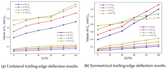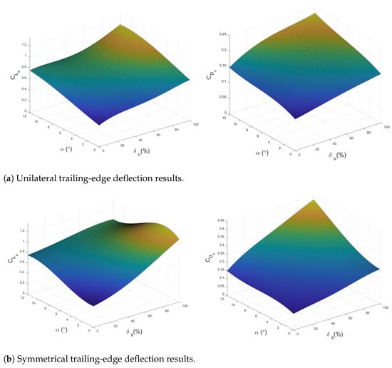 where represents the angle of attack, and represents the trailing-edge deflection. and denote the lift and drag coefficients at the baseline angle of attack (zero angle of attack), respectively. and are the slopes of and . and are the trailing-edge deflection coefficients.