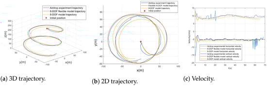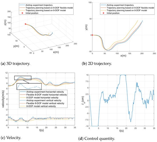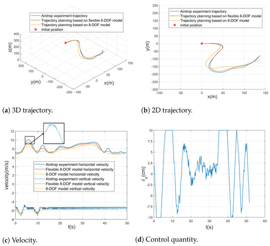 The feasibility of the planned trajectory needed to be validated by comparing the consistency between the planned trajectory in the simulation and the one in the actual experiment. We used the SAC algorithm for trajectory planning in the simulation environment for the 3-DOF model, 8-DOF model, and flexible 8-DOF model. Subsequently, real-time trajectory planning was conducted in both the simulation and actual airdrop environments using the trained model. During the testing process, the system’s position and attitude information were taken as input and directly used to output the target trajectory for the current state. It is worth emphasizing that both the simulation environment and the actual system used the trained model for real-time trajectory planning, without recalculating the trajectory for different initial positions, thus improving the real-time planning performance of the actual system.