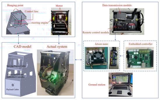 The physical diagram and hardware of the parafoil airdrop system, as shown in Figure 13, were used for the airdrop experiments. The platform is divided into three layers: the bottom layer has small holes to add steel balls (for weight); the middle layer houses the core flight controller, embedded AI computing module, battery, voltage regulation module, and other components; while the top layer has two servos installed on either side for controlling the lines. The control lines are connected to the servo winches via a plastic tube running through the top layer. On each side of the body, there are two hanging points for suspending the main lines of the parafoil.