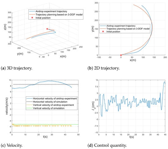 Trajectory planning results of the 3-DOF model in the simulation environment and airdrop experiment.