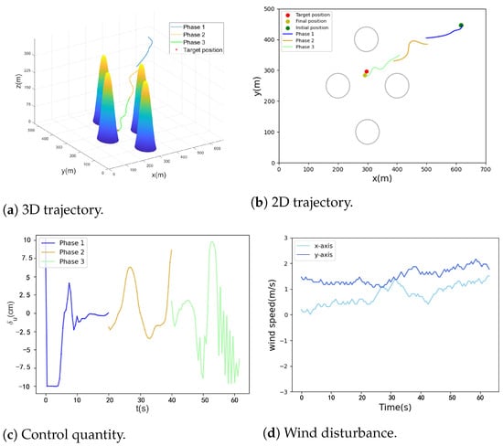 To clearly demonstrate the ability of the parafoil delivery system to adjust the target trajectory in real-time based on current position and orientation information during flight, we simulated two random deviations in the test. As shown in Figure 17a,b, at 20 s and 40 s, the parafoil deviated significantly from the target trajectory. At 20 s, the parafoil deviated 15 m in the positive x-axis direction and 30 m in the negative y-axis direction. At 40 s, the parafoil deviated 30 m in the positive x-axis direction and 15 m in the positive y-axis direction. However, leveraging the algorithm’s powerful real-time planning capability, the parafoil adjusted its target trajectory based on the current position and orientation information. Under the presence of random wind disturbances in the simulation environment, the final landing error was only 7.4 m. Traditional trajectory-planning methods pre-generate fixed trajectories and lack the ability for real-time planning and rolling trajectory generation. Compared to these traditional methods, the approach proposed in this paper alleviates error accumulation to a certain extent and fundamentally improves trajectory feasibility. Figure 17c shows the changes in the control quantity during the flight, while Figure 17d illustrates the random wind disturbances added in the test.