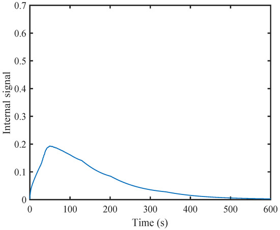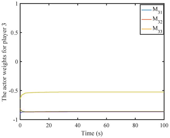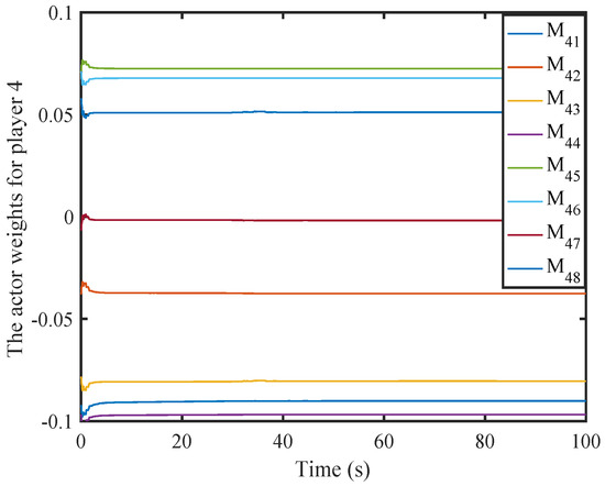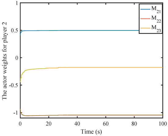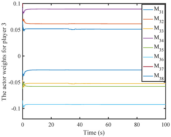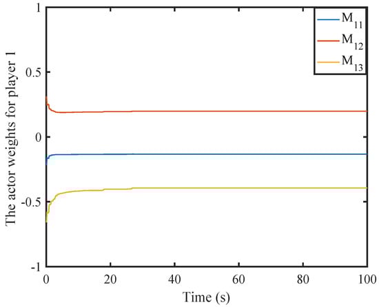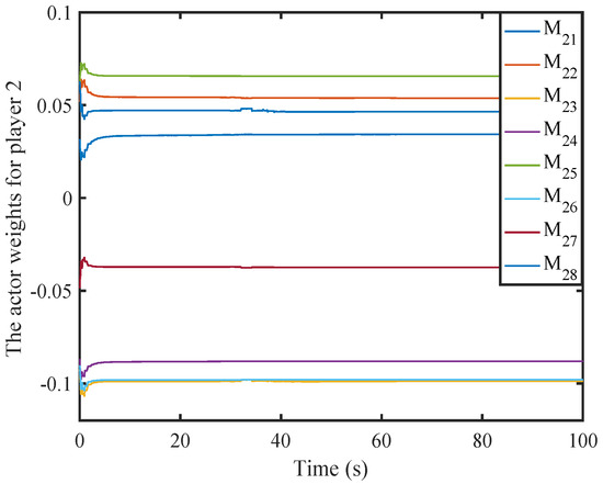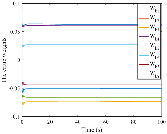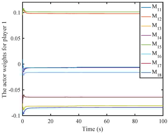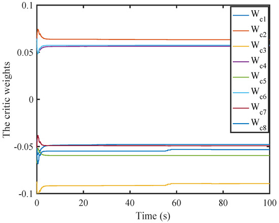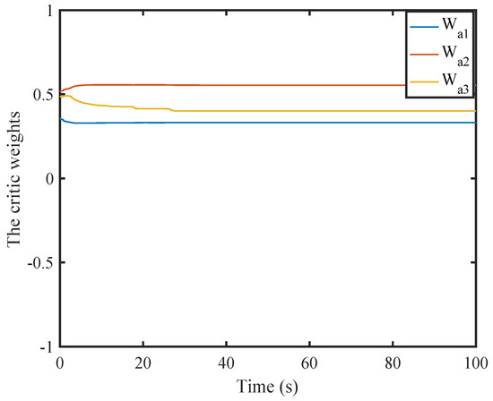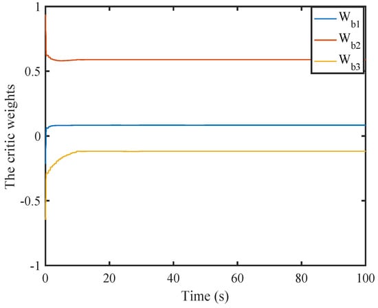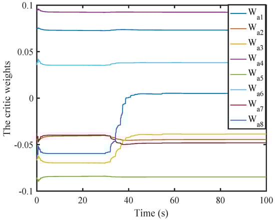 Figure 16, Figure 17, Figure 18, Figure 19 and Figure 20 illustrate the convergence of the critic and actor NNs weight vector. The evolutions of the system states and the control inputs are displayed in Figure 21 and Figure 22, which show that the system states converge and the control signals rapidly converge to zero. Figure 23 and Figure 24 present the norm of the sampling error and the norm of the trigger threshold , and the sampling time , respectively. The internal dynamic signals are depicted in Figure 25. It can be seen that the internal signal is positive.
