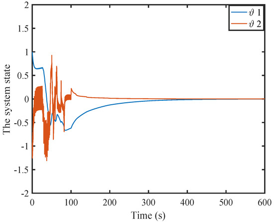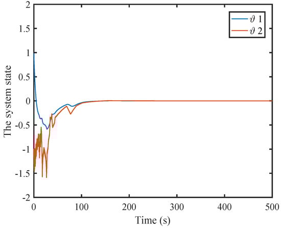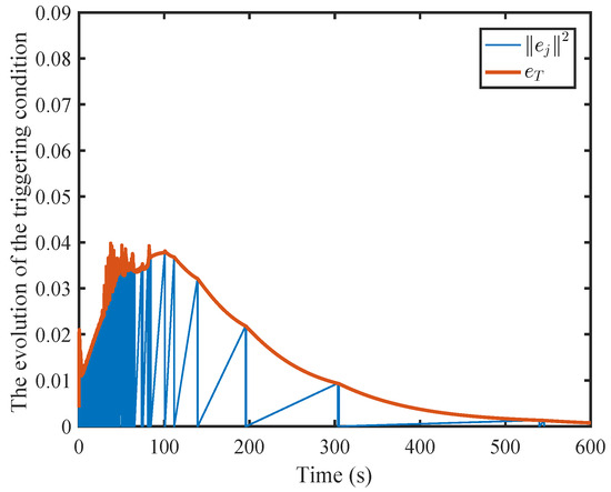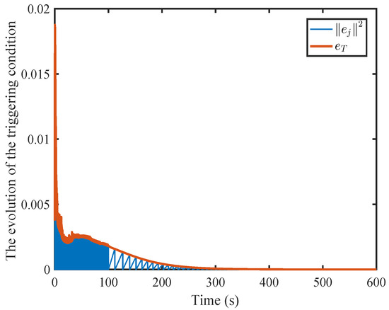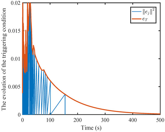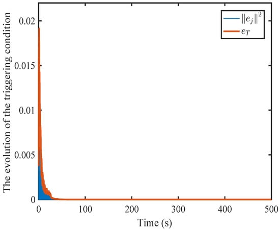 When the dynamic triggering condition (19), designed by us, is satisfied, it yields that . According to Lyapunov’s theorem, the state vector of system (1) can gradually approach zero.
