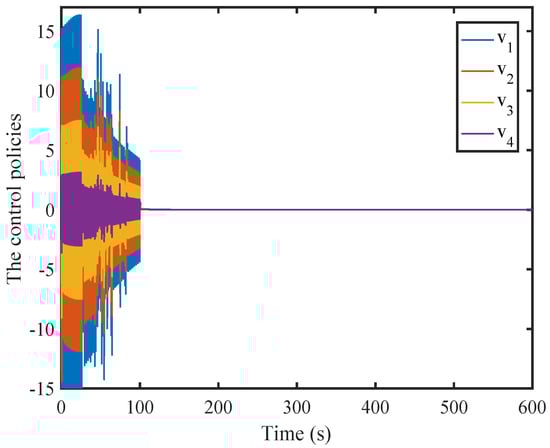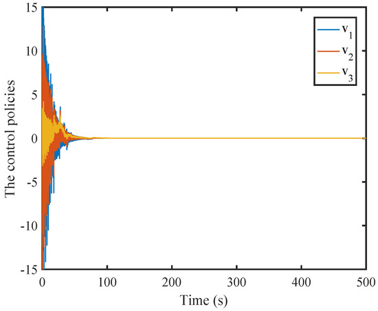 Set , , , and I has appropriate dimensions, , and . For critic NNs, the initial weights are set to [−0.1, 0.1], and the initial weight vectors of the actor NNs are randomly set in the interval . Select the NN activation function as . The initial system state is , and set the sampling time as s. Moreover, select the parameter . The probing control inputs are added, which are .