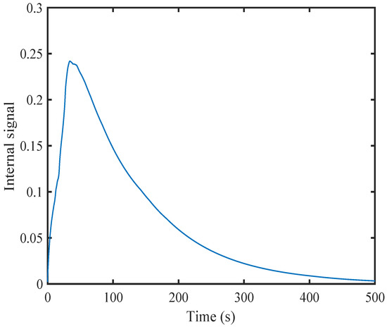 In Figure 12 and Figure 15, the horizontal axis of symbol “*” represents the triggering instant, and the vertical axis of symbol “*” denotes the difference between the current triggering instant and the previous triggering instant. The evolutions of the system states and the control inputs are displayed in Figure 9 and Figure 10, respectively. They illustrate that the system will rapidly converge to zero. The Figure 11 and Figure 14, respectively, provide curves of the sampling error norms triggered by dynamic and static events and the triggering threshold specifications. The sampling times triggered by dynamic and static events are shown in Figure 10 and Figure 15. Figure 13 shows the internal signal. From the graph, it can be seen that the internal signal is positive.