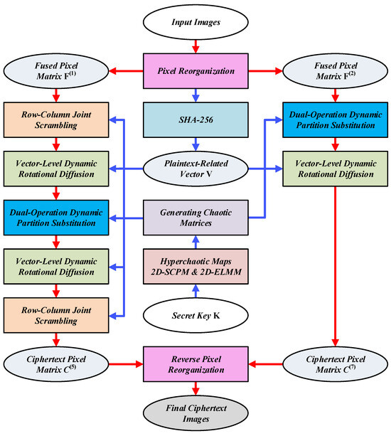 This section introduces the encryption steps and the complete encryption process of our proposed MIEA-PRHM algorithm. In this novel chaotic image encryption algorithm, there are five distinct encryption steps, which are pixel reorganization, generating chaotic sequences, row–column joint scrambling, vector-level dynamic rotational diffusion, and dual-operation dynamic partition substitution. As shown in Figure 2, some of these encryption steps are performed once, while others are performed twice or three times. Next, we introduce these encryption steps in detail one by one.