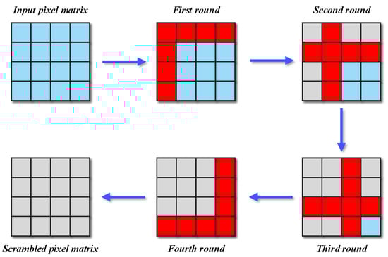 Simple example of row–column joint scrambling: The blue squares represent the pixels of the input pixel matrix, the red squares denote the pixels currently being scrambled, and the gray squares indicate the scrambled pixels.