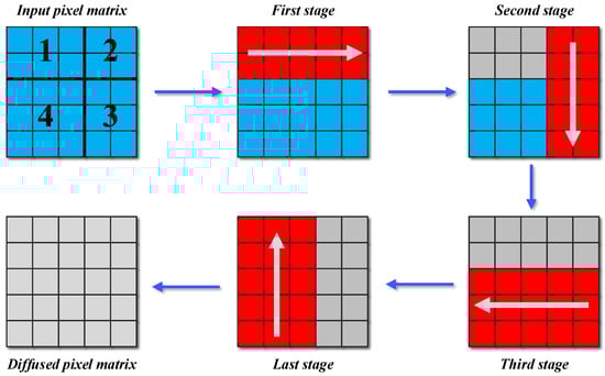 In Figure 4, we provide a straightforward example to demonstrate the proposed vector-level dynamic rotational diffusion. Before initiating the diffusion process, we first determine a partitioning coordinate based on the input pixel matrix’s size, plaintext-related parameters, and chaotic sequence values. Specifically, in this example, the partitioning coordinate is . Consequently, the input pixel matrix can be logically partitioned into four sub-blocks, named for convenience as logical sub-block 1, logical sub-block 2, logical sub-block 3, and logical sub-block 4. Subsequently, the diffusion of all pixels proceeds in four phases. In the first phase, the pixels within logical sub-blocks 1 and 2 are initially diffused. These pixels undergo horizontal diffusion from left to right in the form of column vectors. During the second phase, diffusion occurs in the regions occupied by logical sub-blocks 2 and 3, where pixels are vertically diffused from top to bottom in the form of row vectors. In the third phase, the pixels in logical sub-blocks 3 and 4 undergo diffusion in a manner similar to the first phase but with the opposite direction. During the final stage, the pixels within logical sub-blocks 1 and 4 are diffused in a bottom-to-top manner. As shown in Figure 2, our proposed MIEA-PRHM algorithm performs row–column joint scrambling third times during the encryption process.