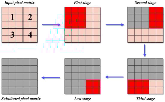 Simple example of dual-operation dynamic partition substitution: The pink squares represent the pixels of the input pixel matrix, the red squares denote the pixels currently undergoing substitution, and the gray squares signify the substituted pixels.