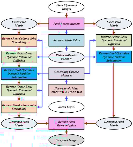 Subsequently, Alice sends the final ciphertext images, along with the hash value , to Bob via the insecure communication channel. Upon receiving them, Bob proceeds to decrypt the ciphertext images according to the decryption process depicted in Figure 6, ultimately acquiring the necessary decrypted images. By examining Figure 6, one can clearly see that the decryption process of MIEA-PRHM is the mirror image of its encryption process. Each decryption step corresponds directly to an encryption step, and is essentially the reverse of its counterpart. Since there are no significant differences, we will, for brevity’s sake, omit the redundant description of these decryption steps here.