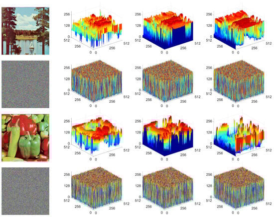 Experimental results of pixel distribution assessment for MIEA-PRHM: in the first column, the test images 4.2.06 and 4.2.07, along with their encrypted images, are presented; the second column exhibits the 3D pixel distribution plots of the red channels for the images displayed in the first column; the third column showcases the pixel distribution plots of green channels; and the final column depicts the pixel distribution plots of blue channels.