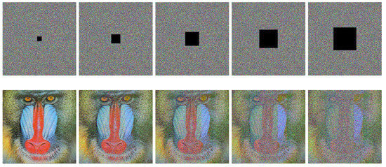 It is conceivable that during the transmission or storage of encrypted images, their ciphertext pixels may be subject to loss or corruption. Consequently, a robust image encryption algorithm ought to possess the capability to withstand a certain degree of ciphertext pixel loss or corruption []. To verify the robustness of the MIEA-PRHM, we conduct an array of evaluation experiments on the encrypted images it generates.