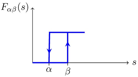 In engineering and control, the starting point of discussions of hysteresis is a hysteron, which is a two-state agent/black box, for which there exist two values, and , , of a control parameter s, such that if , the hysteron is in state 1 and if , it is in state 0. For , the state of the hysteron depends on its history: one says that the hysteron remembers (some of) the past history of the values s has gone through. One can denote a hysteron by , which outputs 0 and 1 according to the rules explained above; see Figure 1 for illustration (note that the motion on horizontal segments is bi-directional). The state of the hysteron is uniquely determined by the history of change of the control parameter s. Note that adjustment of the hysteron to the control parameter is instantaneous and synchronous. In such a case, we say that hysteresis is rate-independent: it is not important how fast s changes. If s stops changing, so does the state of the hysteron.