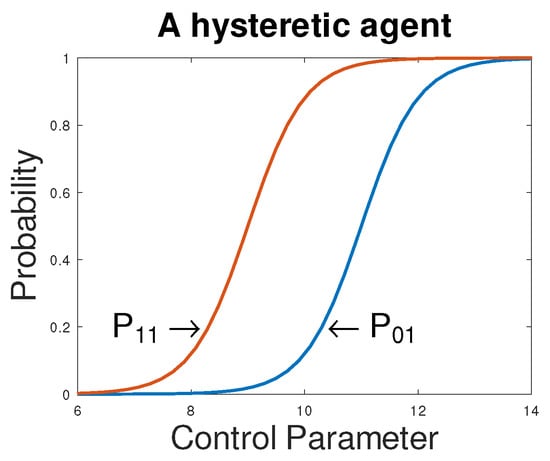 We say that an agent is hysteretic if the probability of an agent in state 0 to switch to state 1 is for every value of the control parameter s less than the probability of an agent in state 1 to stay in that state, such that has a unique minimum, where .