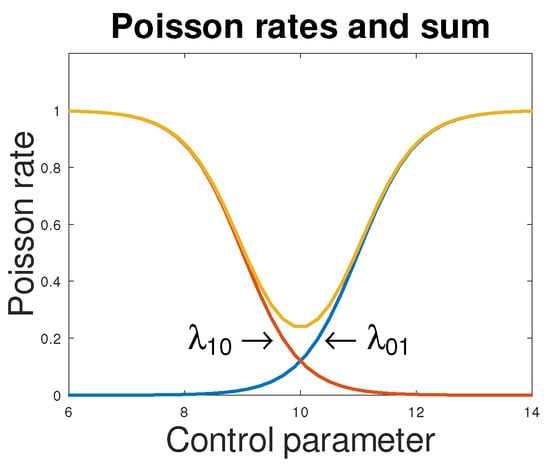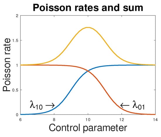 and now assume that the intensities and of the counters are functions of . (In the simulations below, we take the intensities and to be independent of k; we use shifted tanh functions for the intensities, such as