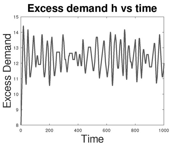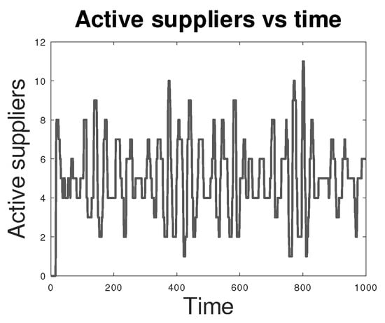 As mentioned, deriving a Fokker–Planck equation for is a hard analytical problem. On the other hand, numerical simulation in the Poisson counter set-up is easy and the results are intuitive: the more valves there are, the smaller the variance (in fact, the mean field limit is very easy to analyse); the bigger the area of the hysteresis loop, the bigger the variance. In Figure 5 and Figure 6, we show the result of simulations for identical suppliers. Here, time is measured in the number of timesteps taken by the simulation.