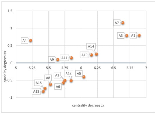 Step 6: According to Formulas (15)–(18), the degree of influence Dx, the degree of being influenced Cx, the degree of centrality Jx, and the degree of cause Kx are calculated for each factor, respectively.