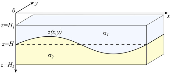 Let us define the structural gravity problem. Consider two layers (Figure 1). The upper layer is bounded by the plane at the top and by the surface at the bottom. The lower layer is bounded by at the top and by the plane at the bottom. The density of the upper layer density is , and the density of the lower layer is . The surface has a horizontal asymptotic plane .