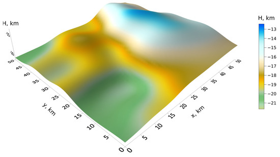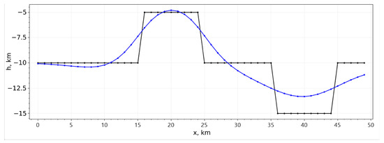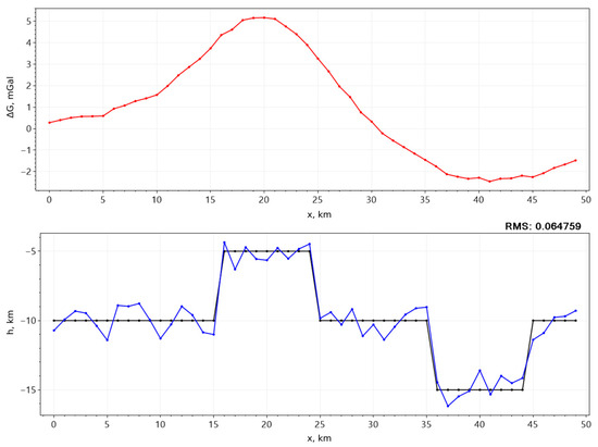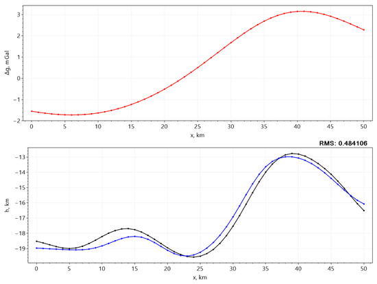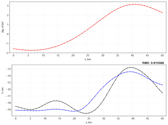 Let us consider a model example. Suppose there are two local objects (a protrusion and a depression) located at a depth below the Earth’s surface, symmetrically positioned relative to a plane at a depth of km (Figure 3, lower). The model has the following parameters: a resolution of 50 × 50 points and a grid spacing of 1 km in both directions. The density of the upper layer is 2.3 g/cm3, and the density of the lower layer is 2.4 g/cm3, and, therefore, g/cm3. The recovery was conducted using a flat plane km as the initial approximation. It took 19 iterations (with to achieve a root mean square (RMS) deviation of RMS < 1 for the recovered boundary from the initial one. The result of the recovery is shown in Figure 4 (blue curve).