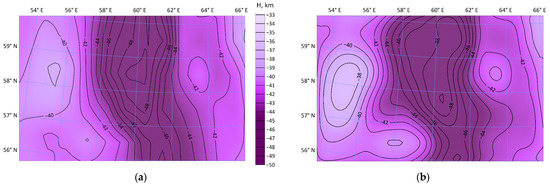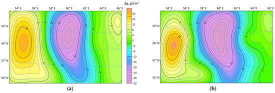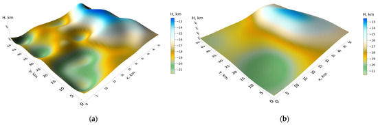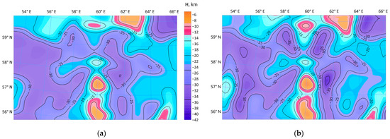 The initial approximation of the Moho boundary is based on the Crust 1.0 dataset (Figure 17a). Within the study area, the depths of this boundary range from 38.6 to 49.3 km. Based on the previously constructed density model of the initial approximation, the density contrast at the boundary is determined to be 0.2 g/cm3. This density is used to calculate the Moho boundary field.