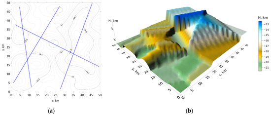 In the second experiment, we create an initial approximation surface, thereby simulating the use of a priori data on the surface geometry during the reconstruction process. Consider three profiles (Figure 11a), along which the depth data of the boundary is collected. In reality, this can be achieved using seismometric methods. The experiment uses the exact values of the depth of the actual boundary. These values are interpolated across the study area using the nearest neighbor method (Figure 11b).