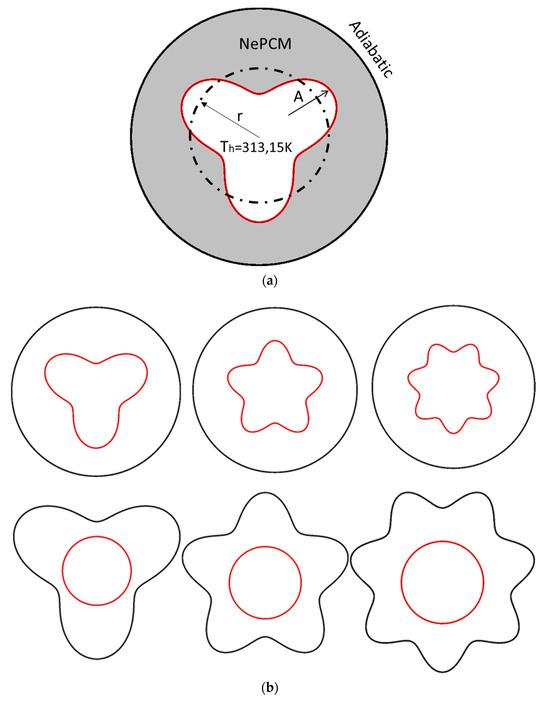 The research utilizes undulating walls to accelerate the charging process of a shell-and-tube latent heat thermal energy storage (LHTES) unit. Figure 1 displays the cross-section that has been studied, together with its boundary conditions. The container is loaded with a composite material consisting of paraffin wax reinforced with nanoparticles of copper (Cu). The copper nanoparticles have a diameter of 50 nm and volumetric fractions of 0% (pure PCM), 4%, and 8%. The heating liquid flows in the inner tube while the external tube is insulated.